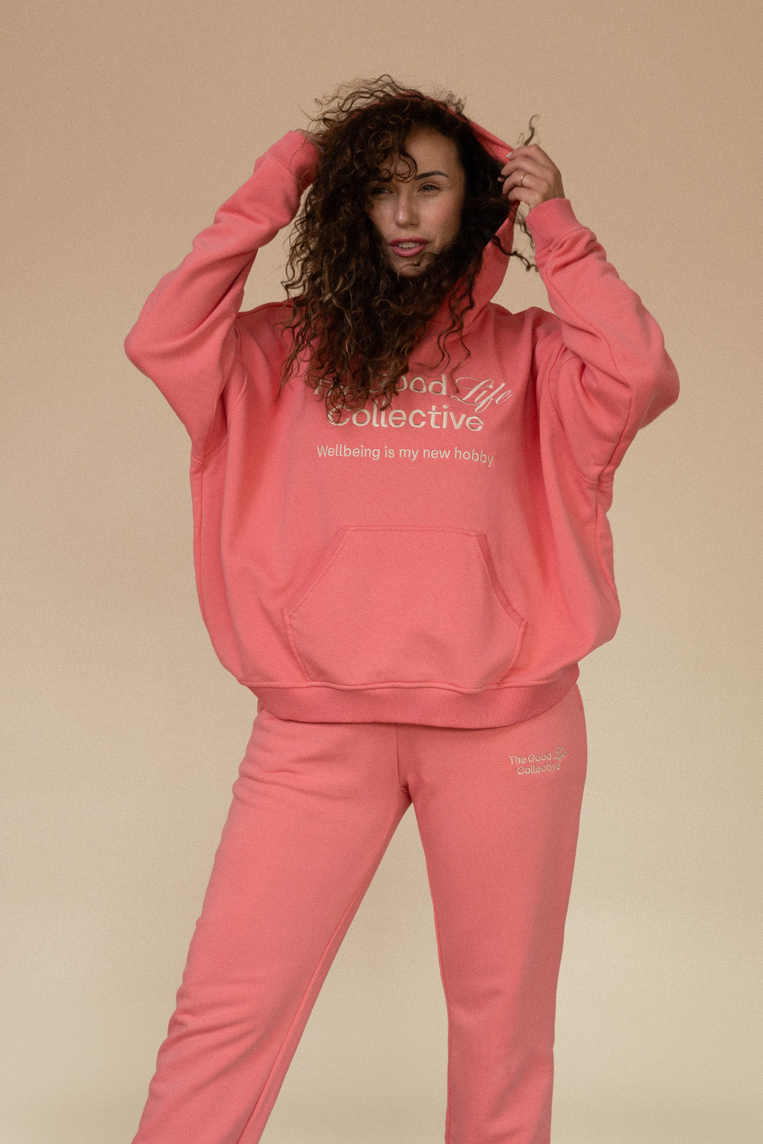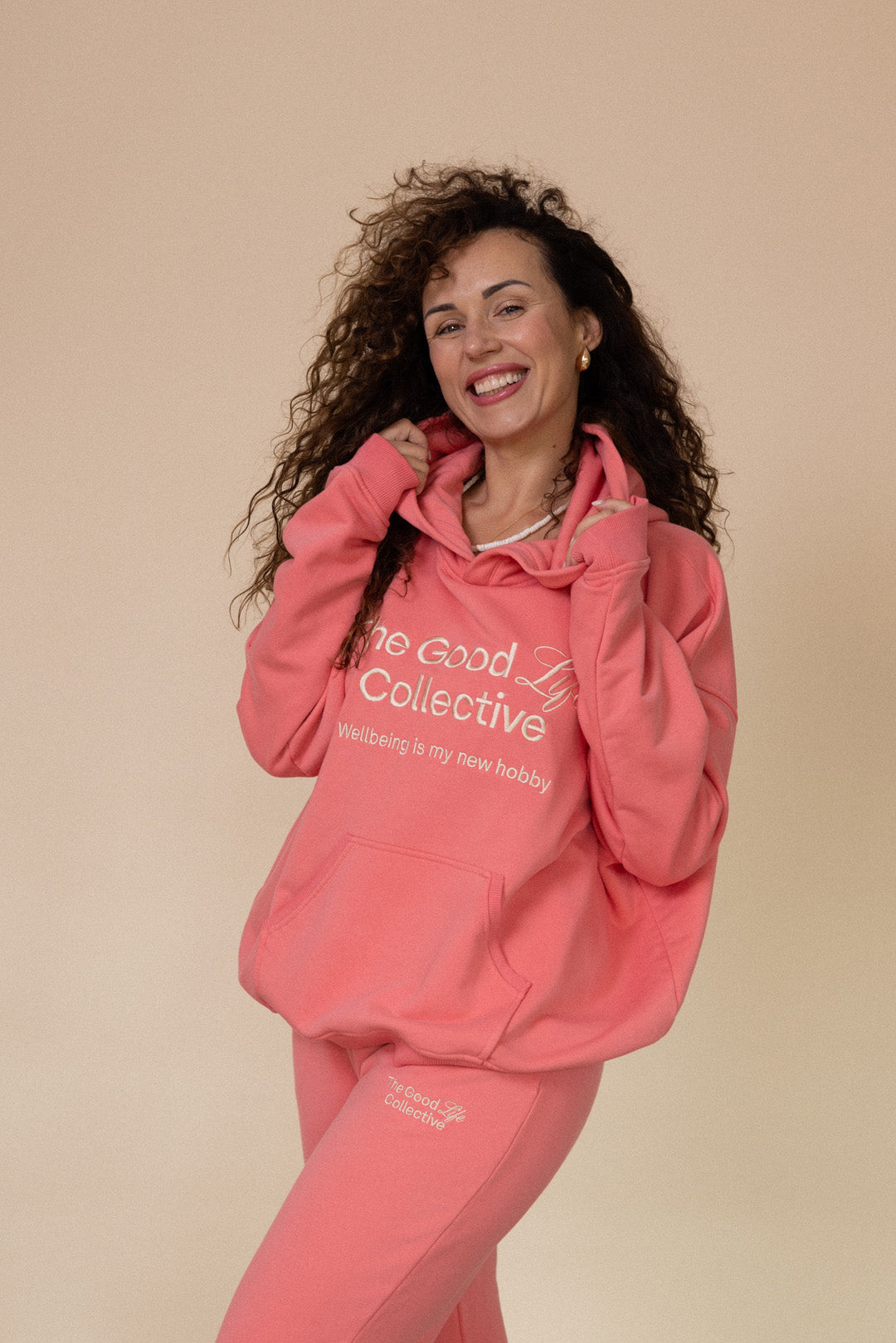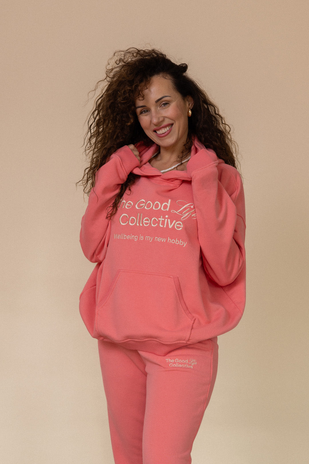 - Na przodzie kremowy haft z napisem The Good Life Collectiwe oraz hasłem przewodnim marki 'Wellbeing is my new hobby'.