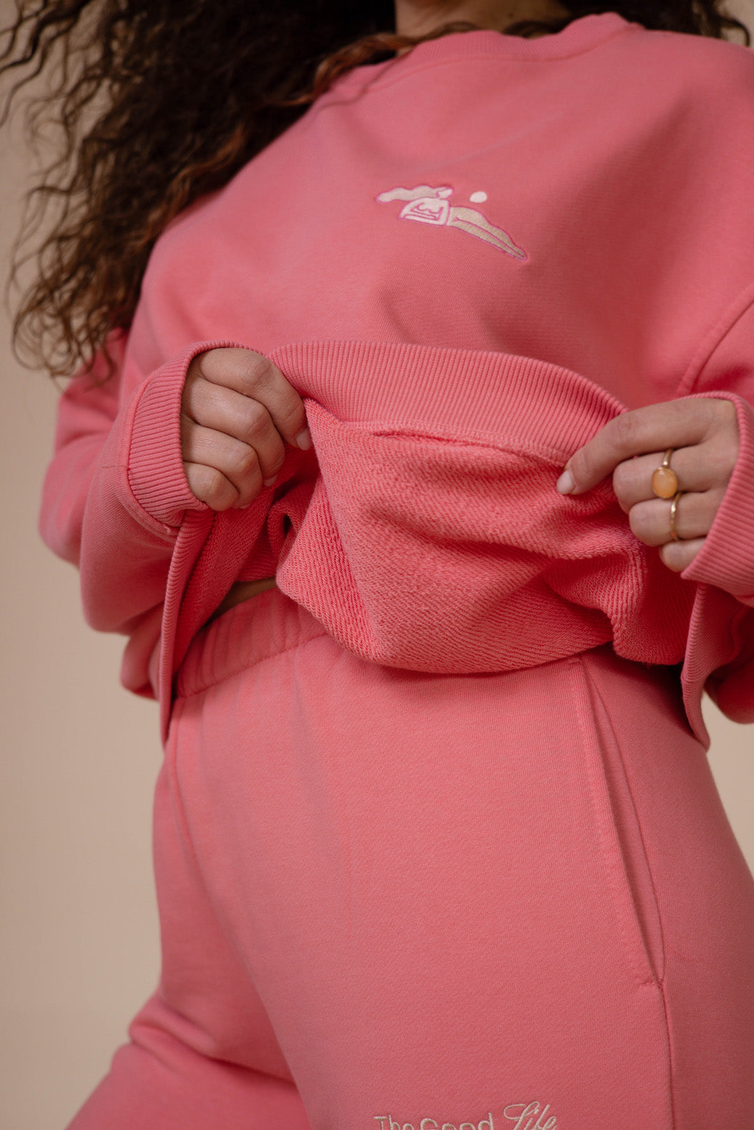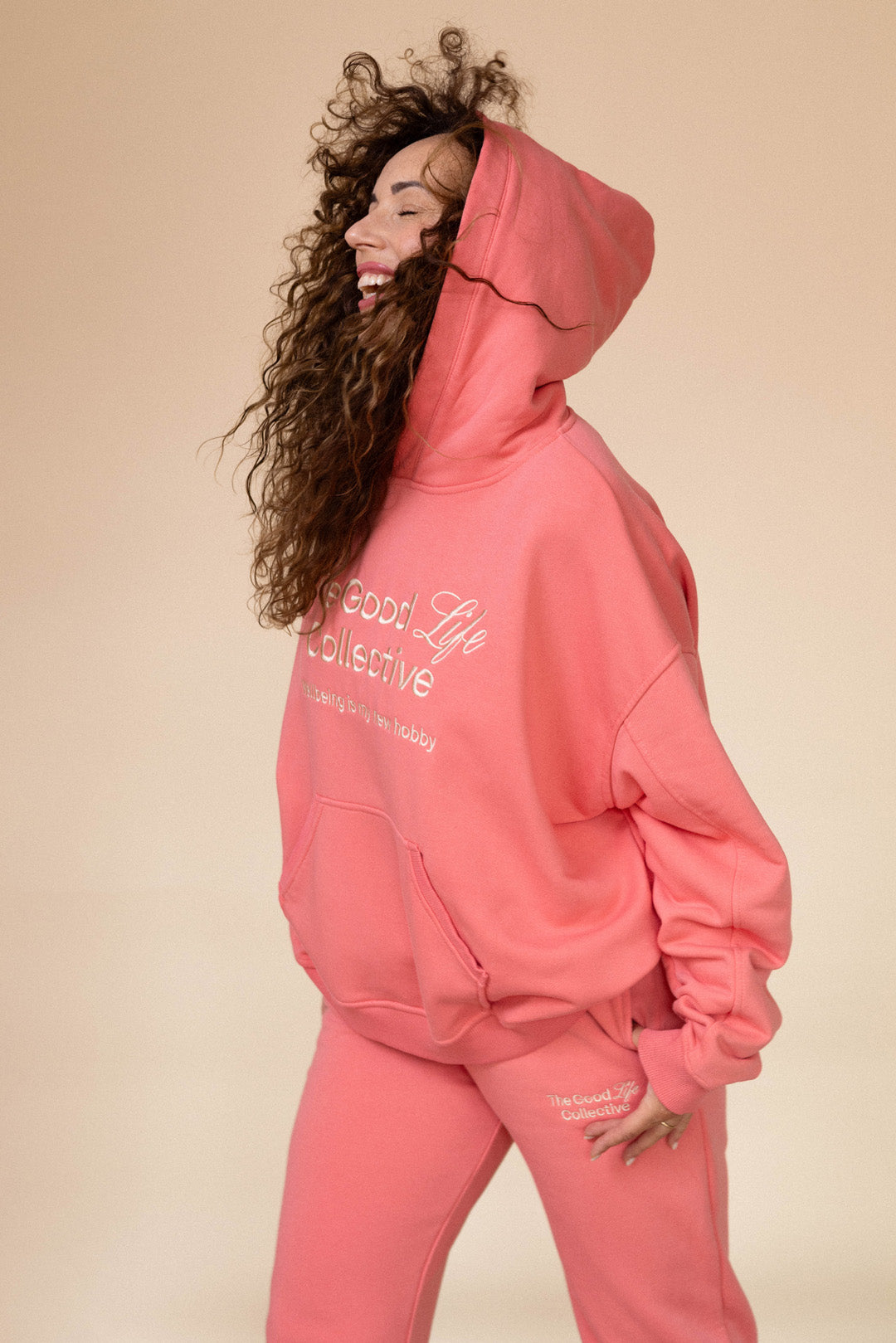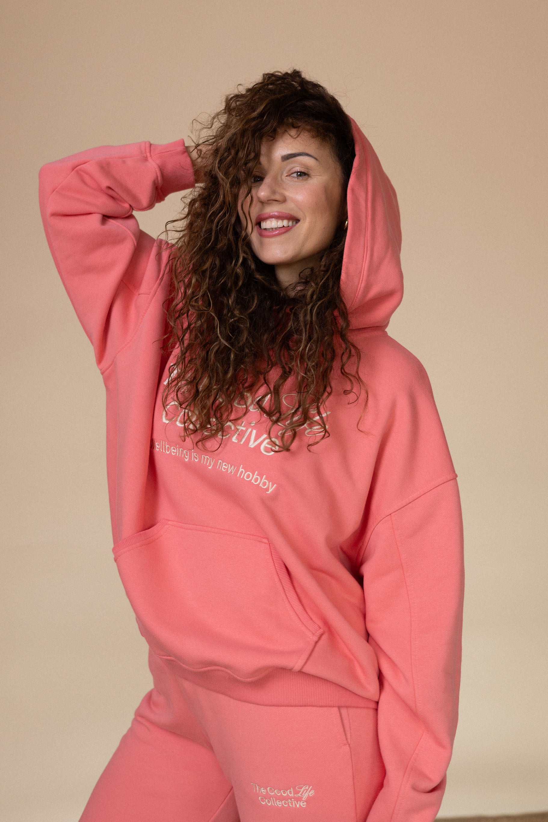 - Na przodzie kremowy haft z napisem The Good Life Collectiwe oraz hasłem przewodnim marki 'Wellbeing is my new hobby'.