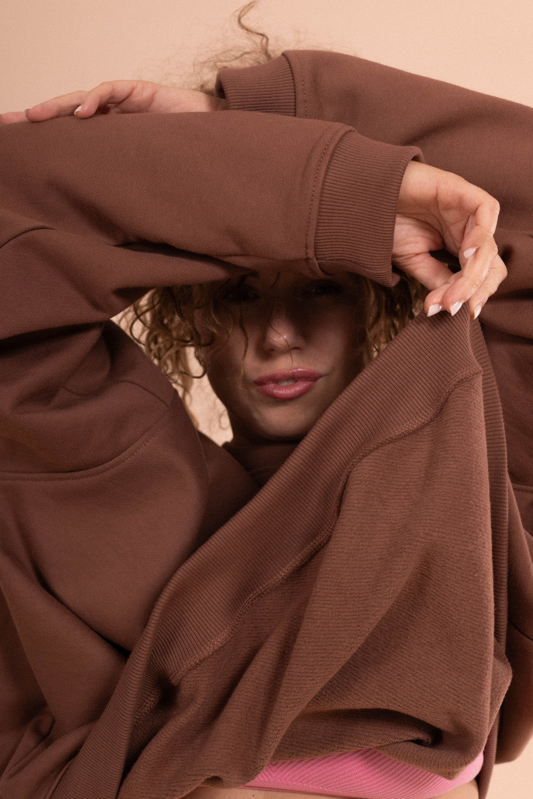 Bluza Bossa w kolorze orzeszka laskowego powstała z wyjątkowej dzianiny, której szukałam naprawdę długo – i udało się! Jest nieco grubsza (400 g/m²) i delikatnie szmerglowana, co sprawia, że jest niezwykle miękka i przyjemna dla skóry (lubię nosić ją nawet bez koszulki). Do tego jest naprawdę ciepła!