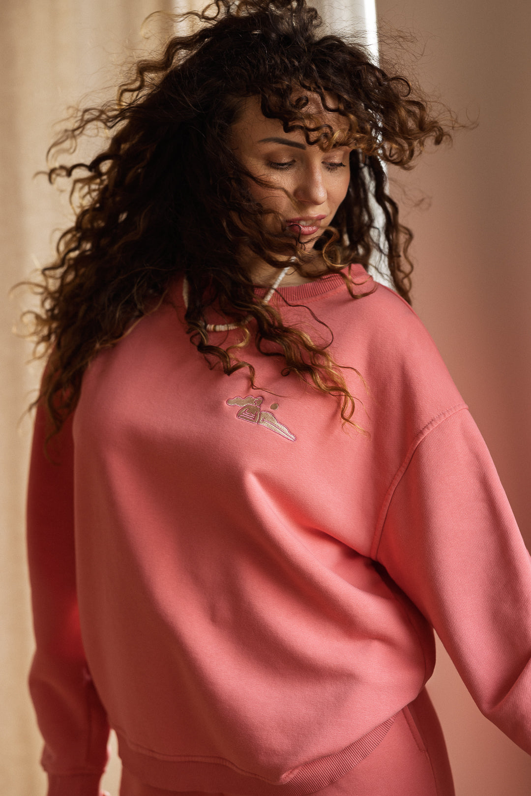 - Bluza w kolorze stworzonym na zamówienie - peachy pink oraz z widoczną strukturą diagonalną po wewnętrznej stronie.