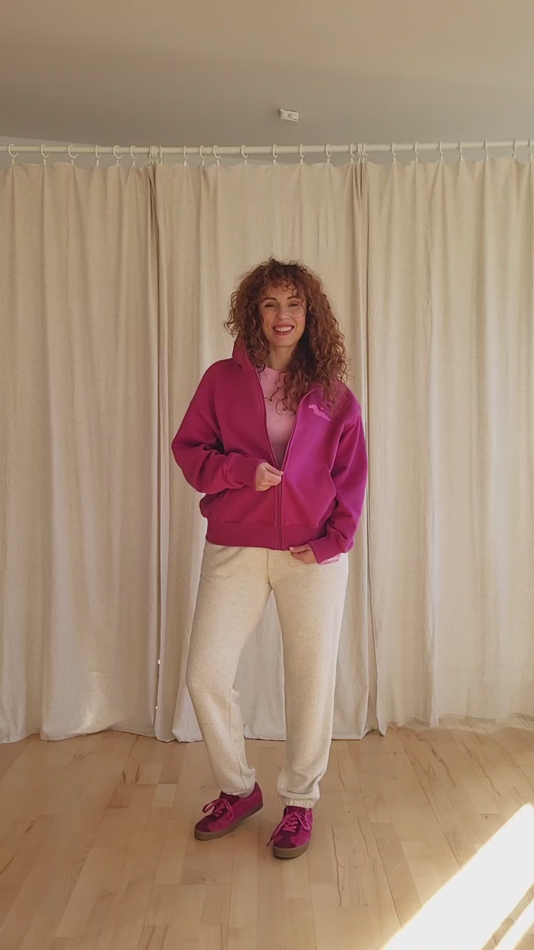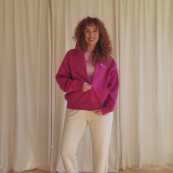 JOLENE w amarantowym kolorze to typowo wierzchnia bluza w stylu GET&GO. Celowo wybrałam do niej dzianinę o nieco wyższej gramaturze i lekkim szmerglowaniu, dzięki czemu idealnie spełnia funkcję termiczną. Jest niezwykle miła w dotyku i przyjemnie otula, dlatego świetnie sprawdzi się w chłodniejsze dni lub wieczory. Najczęściej zestawiam ją ze spodniami dresowymi KIMMY z dodatkiem lnu. Rewelacyjnie wygląda również z jeansami, sportowymi kurtkami lub kamizelkami w stylu bomberki oraz sneakersami. Najczęściej zakładam ją, gdy wybieram się na siłownię, termy lub basen.