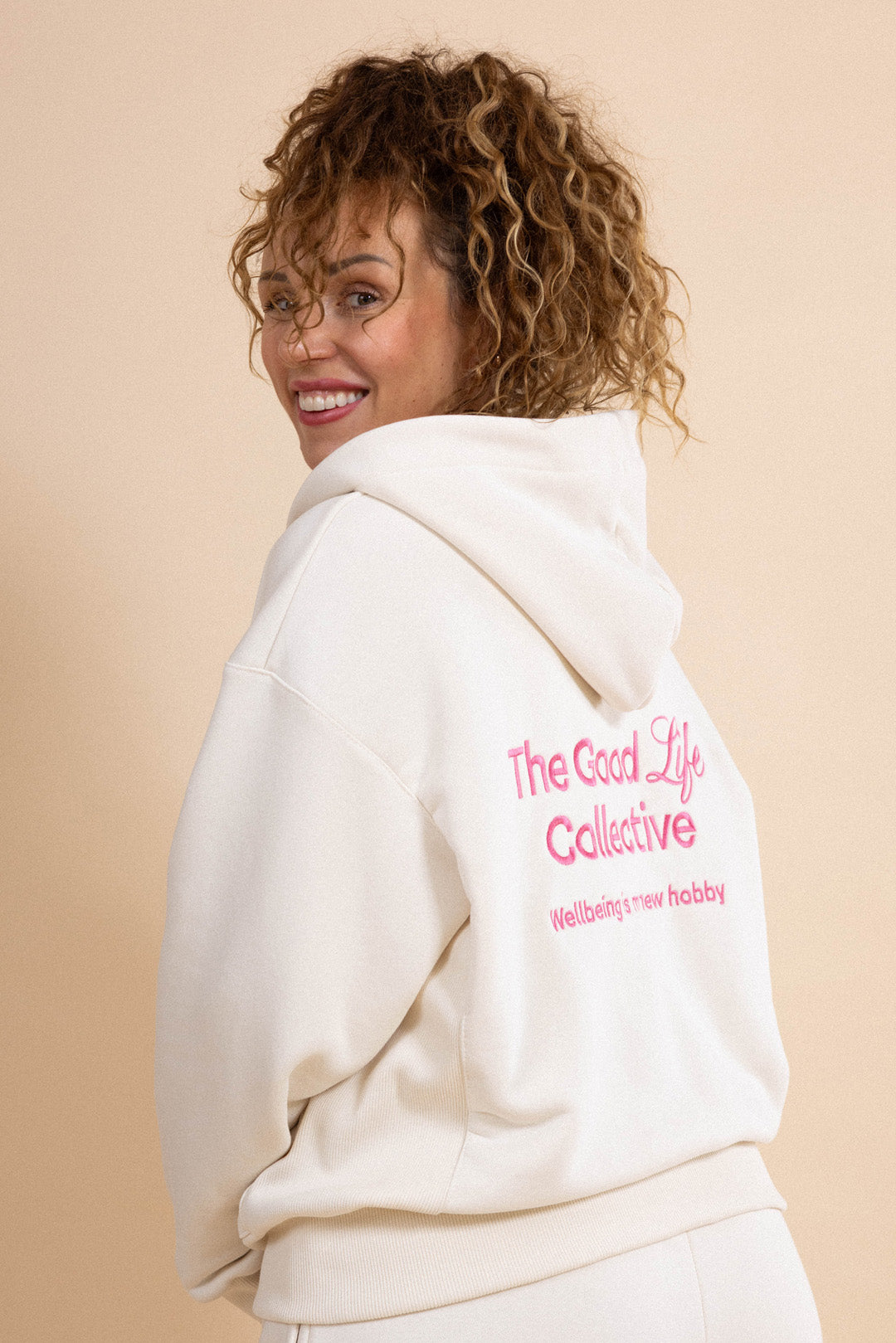 Na przodzie haft z logo kobiety, będącej super hero brand'u, a na tyle duży haft z napisem The Good Life Collective oraz hasłem przewodnim mojego brandu czyli 'WELLBEING IS MY NEW HOBBY'.