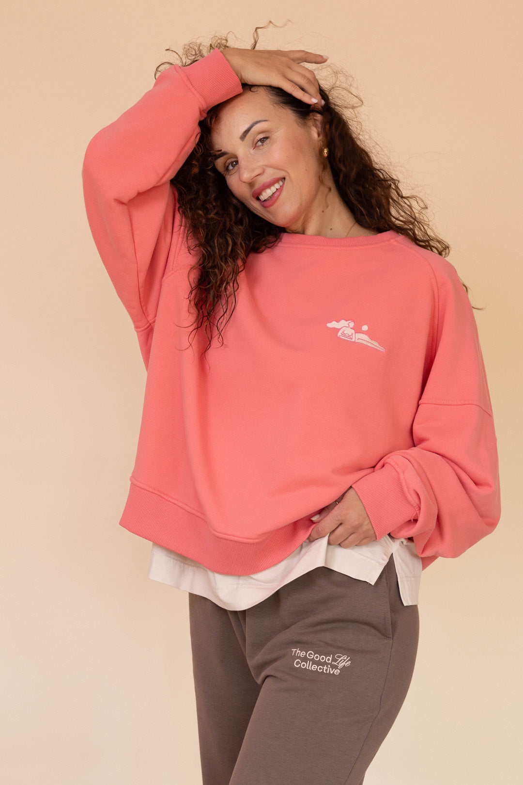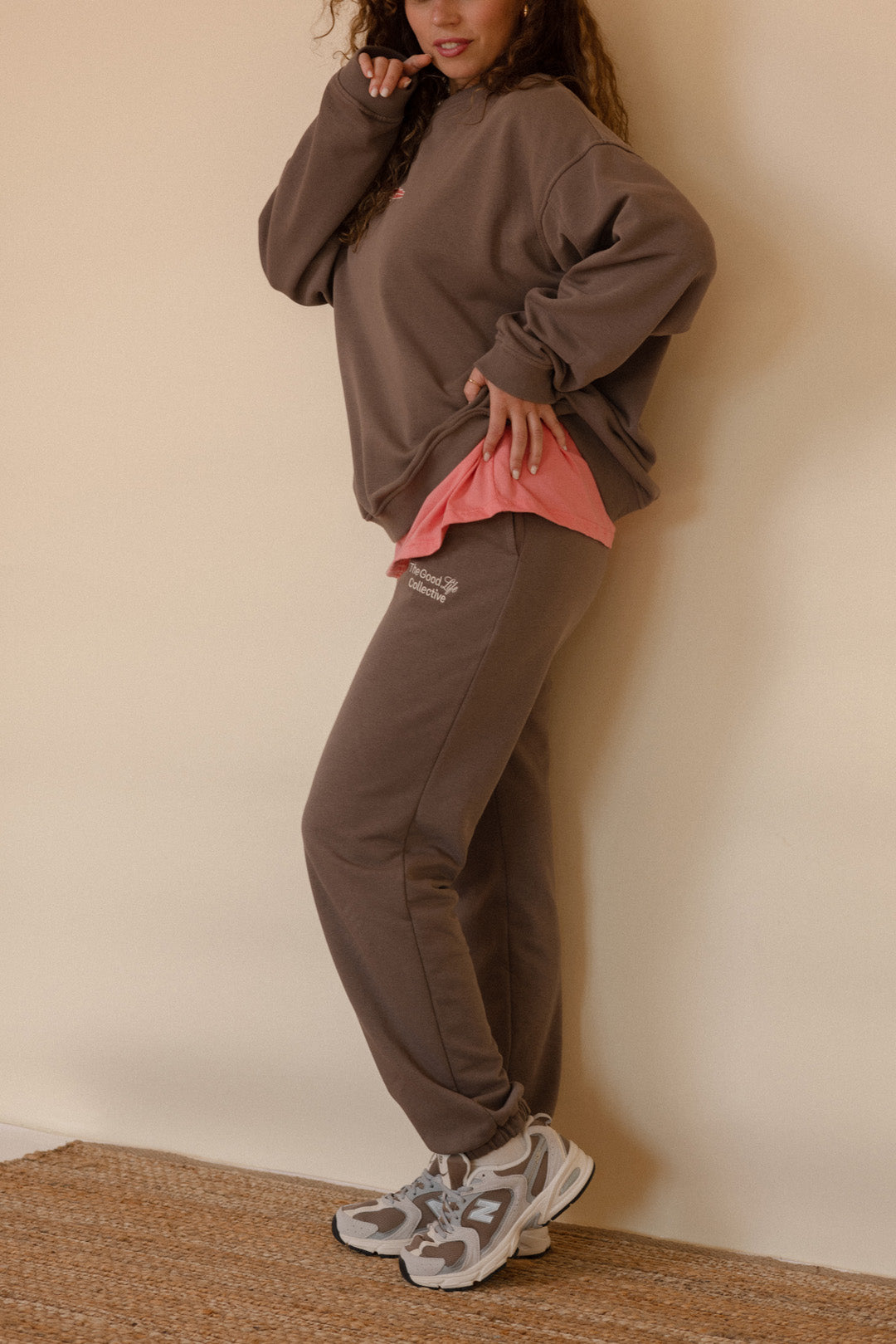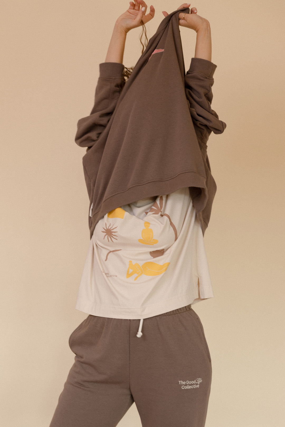 Spodnie dresowe SIERRA polecam do kompletu z bluzą BOSSA w tym samym kolorze, a także z bluzą BIG BUDDA z limitowanej kolekcji, ozdobioną grafiką w stylu WELLBEING. Świetnie pasują również do kremowej koszulki z prążka SELENA, uszytej w ciekawym połączeniu z szerszą lamówką w kolorze peachy pink.