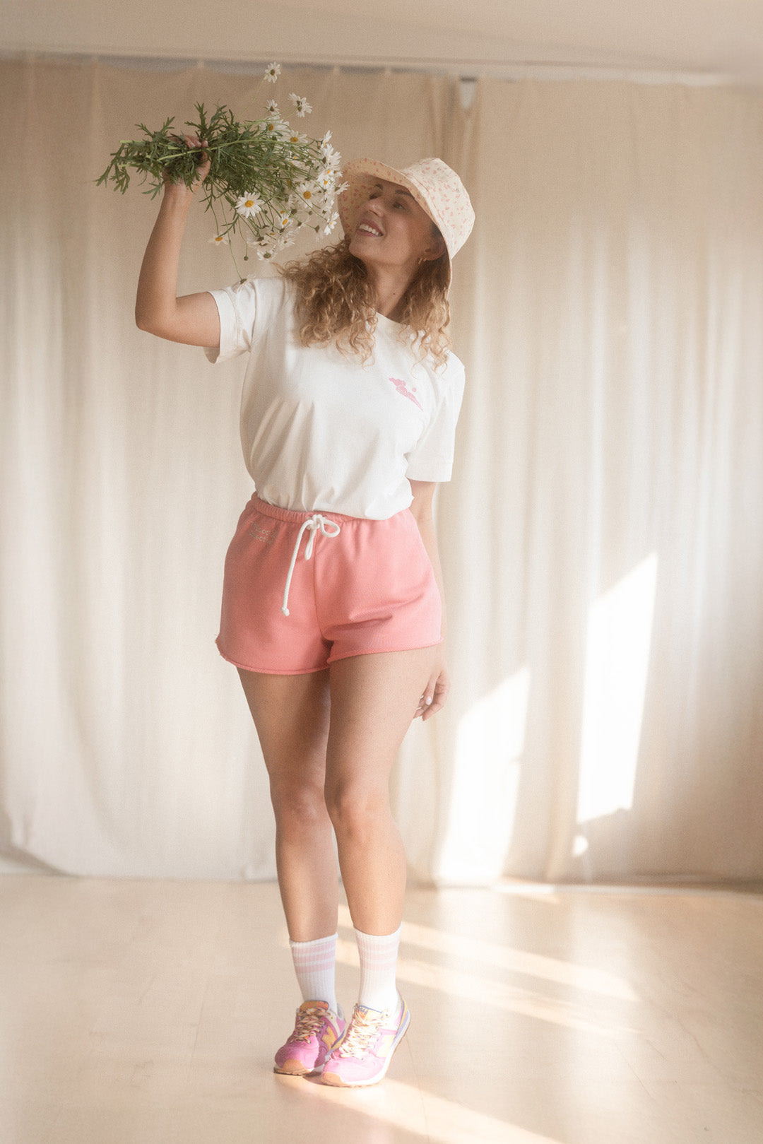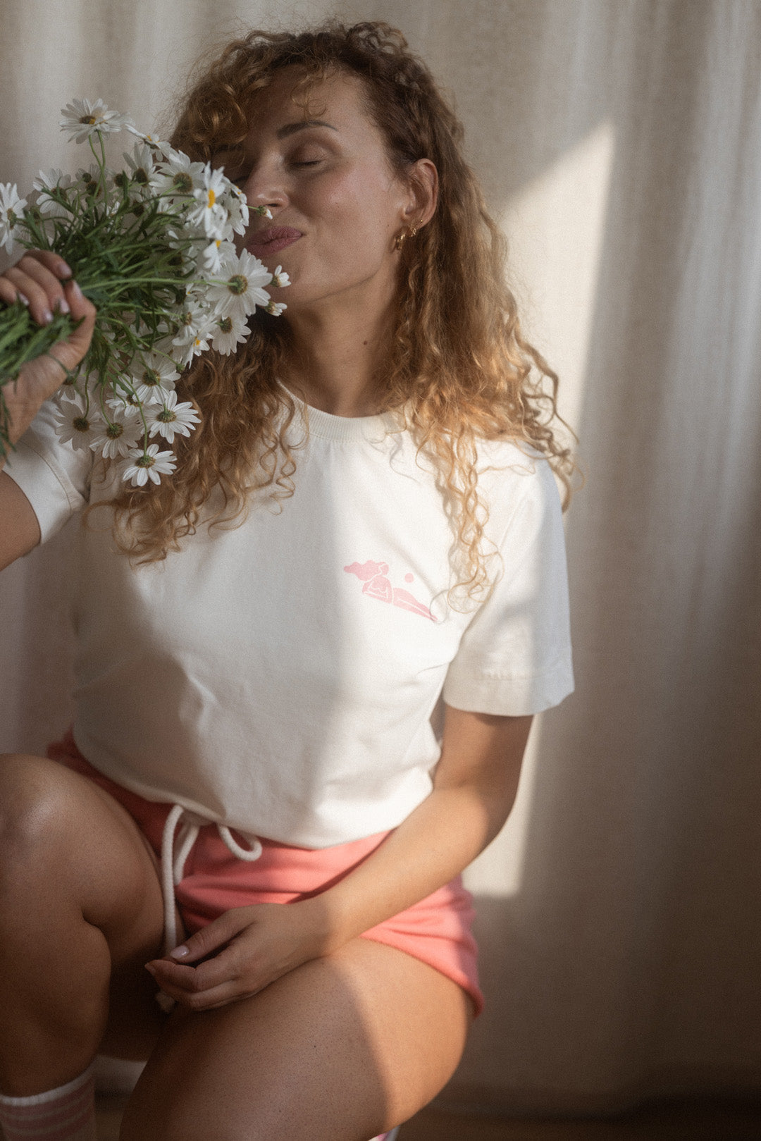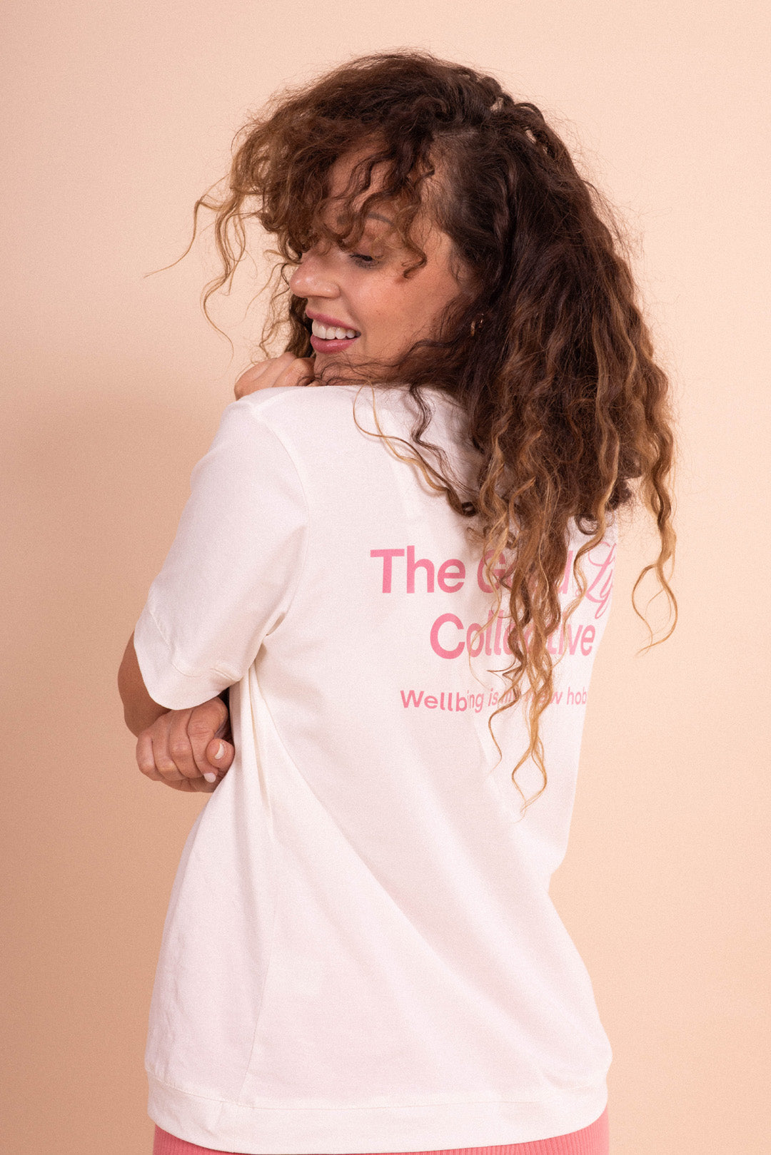 T-shirt NOBU by The Good Life Collective. jest wizytówką mojego brandu, dlatego zaprojektowałam go tak, abyś mogła zestawiać go ze wszystkimi ubraniami z najnowszego dropu. Jej odcień 'milky white' i różowe logo, a także napis 'Wellbeing is my new hobby' idealnie komponują się z kolorystyką oraz vibe'm całego dropu. Koszulkę możesz nosić na wierzchu, wpuszczoną do środka, jak i zawadiacko zawiązać w supełek na plecach.